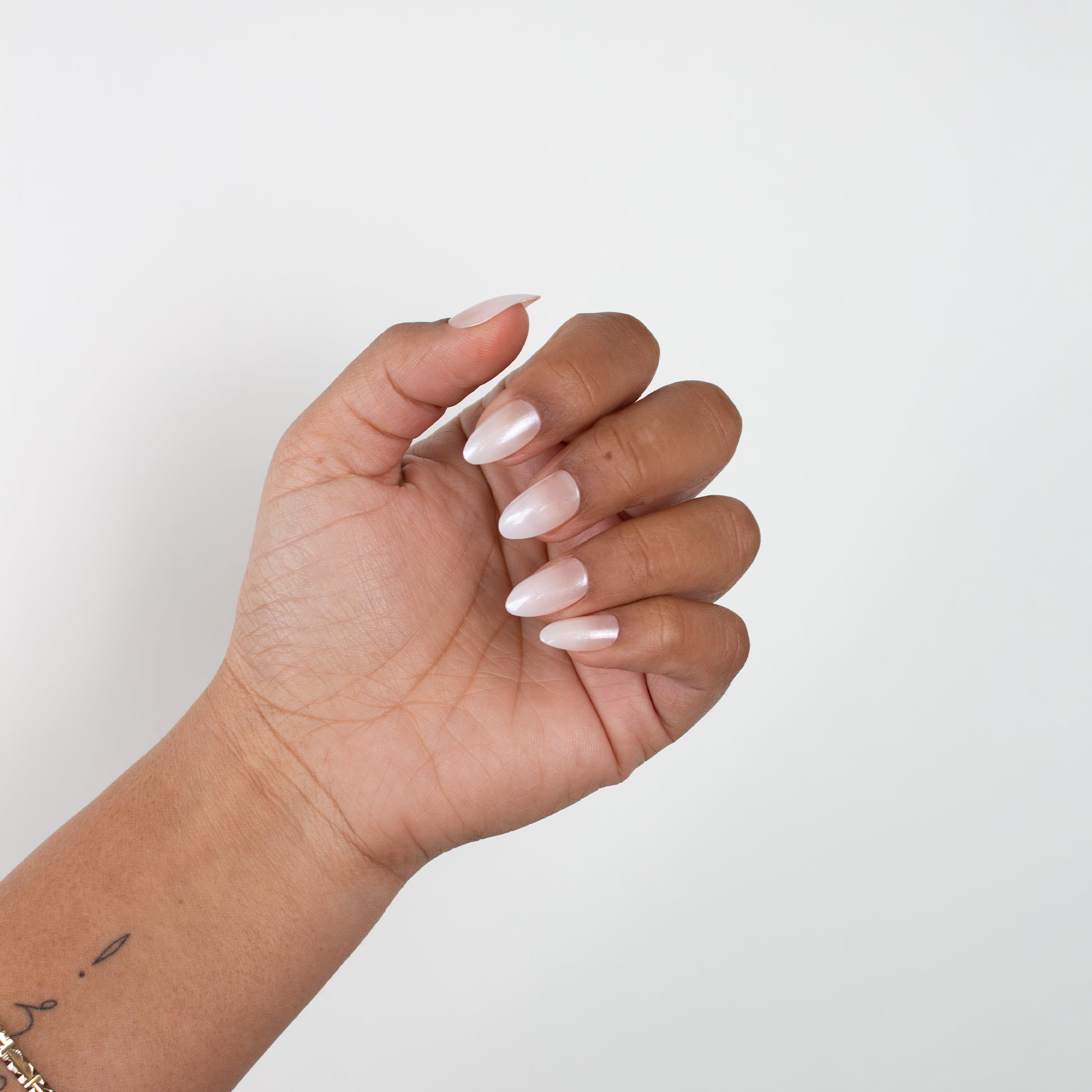 Align the bottom of the press-on nail to your cuticle line at a downward angle. Press down from the base to tip and hold for 20 seconds to ensure a secure bond. If excess glue seeps out quickly clean up using the cuticle stick.