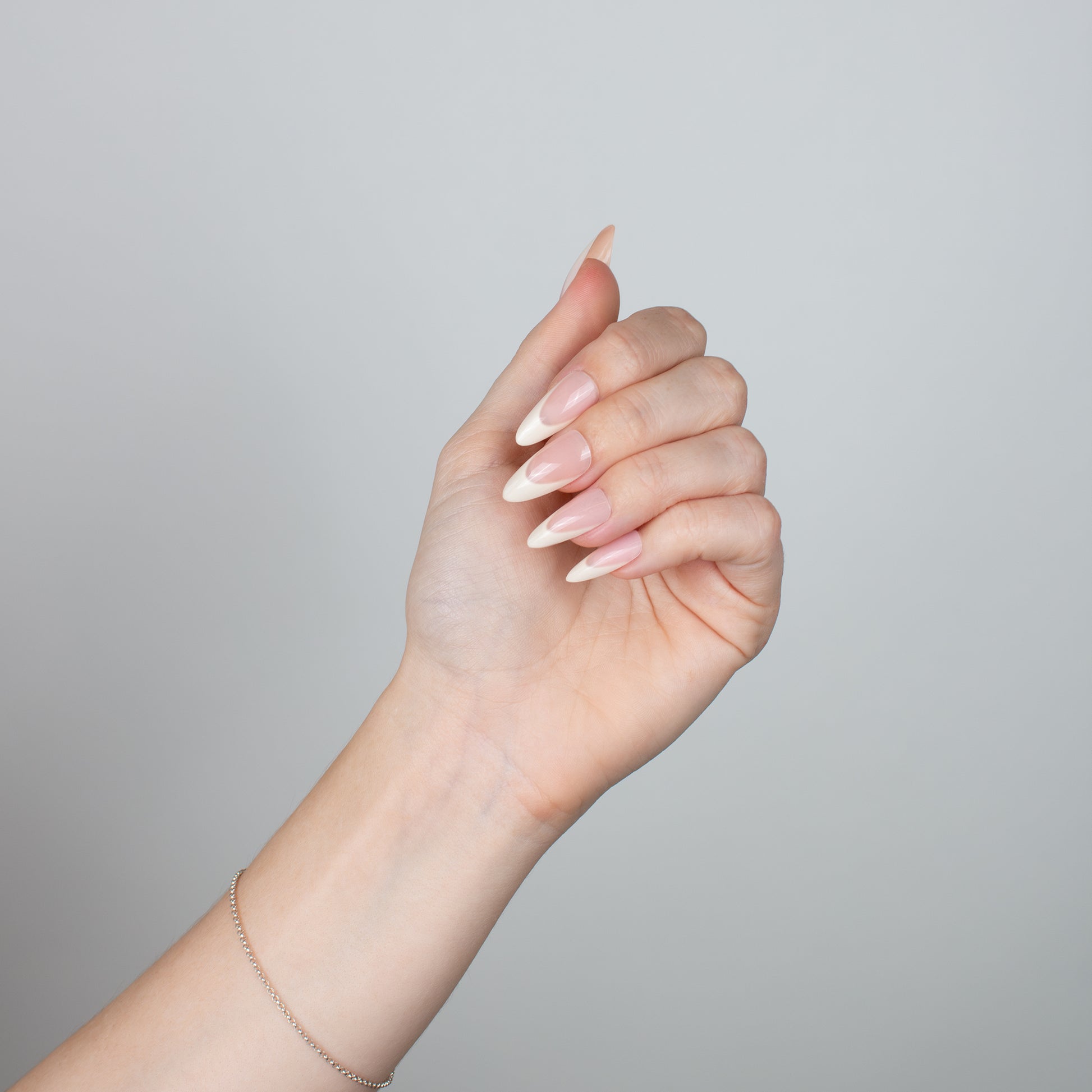 Chantilly French is a sexy yet sophisticated alternative to the classic french tip with an off white finish in an elegant long stiletto shape.