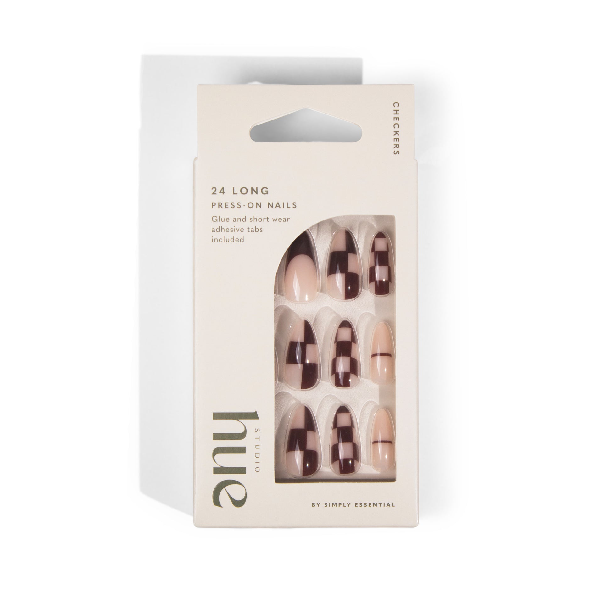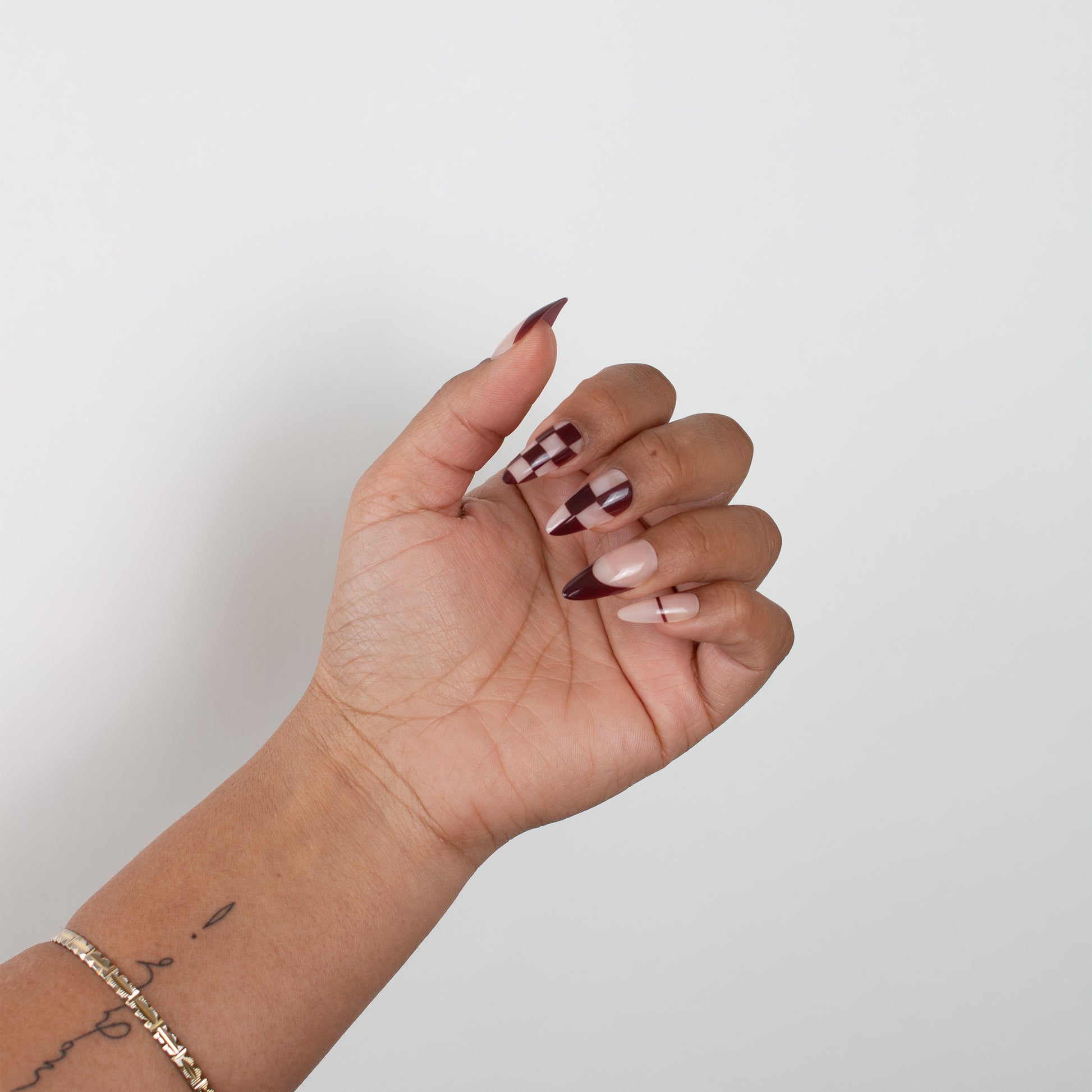 Checkers is sure to turn heads! A mix of check and french designs in a sophisticated dark red hue and a striking long stiletto shape.