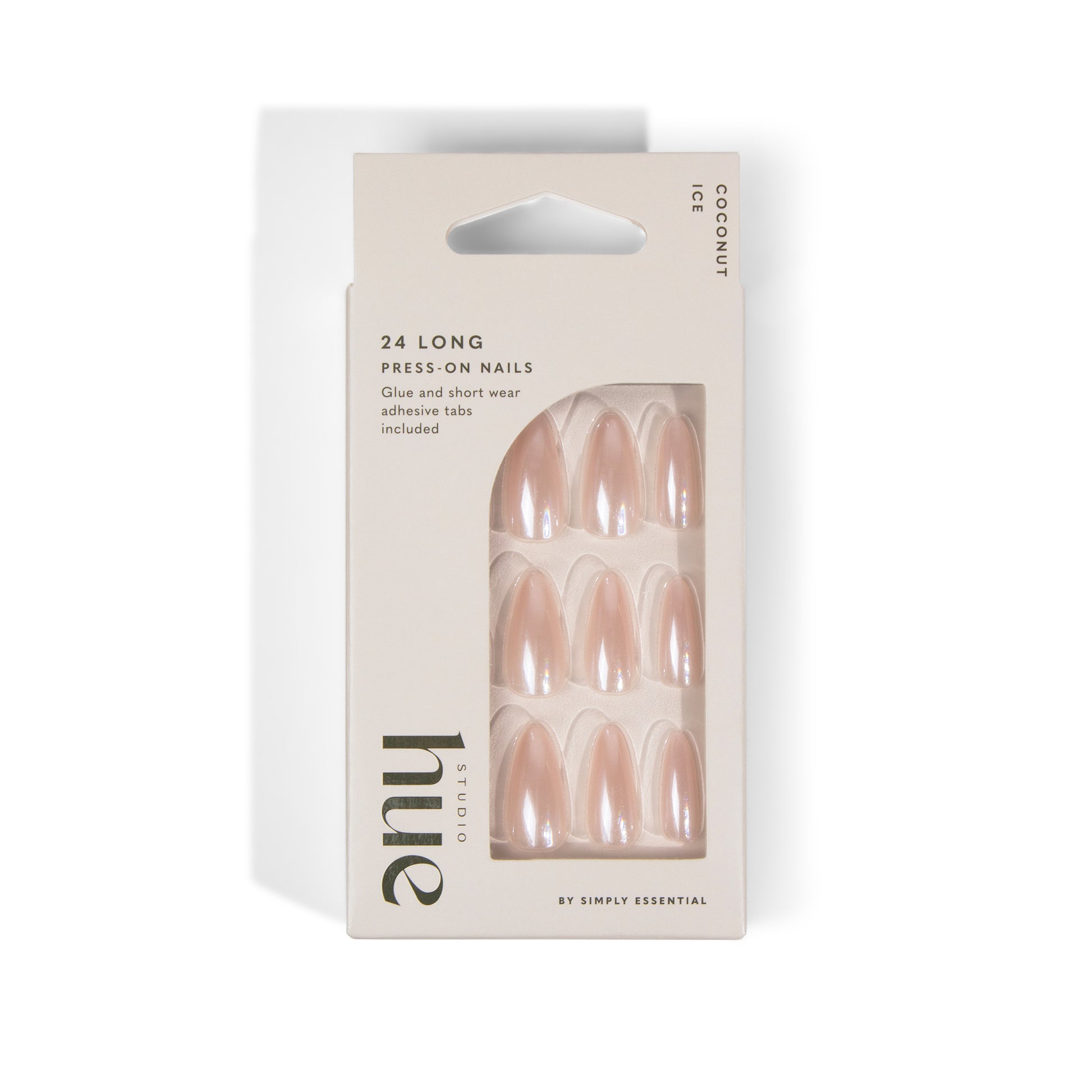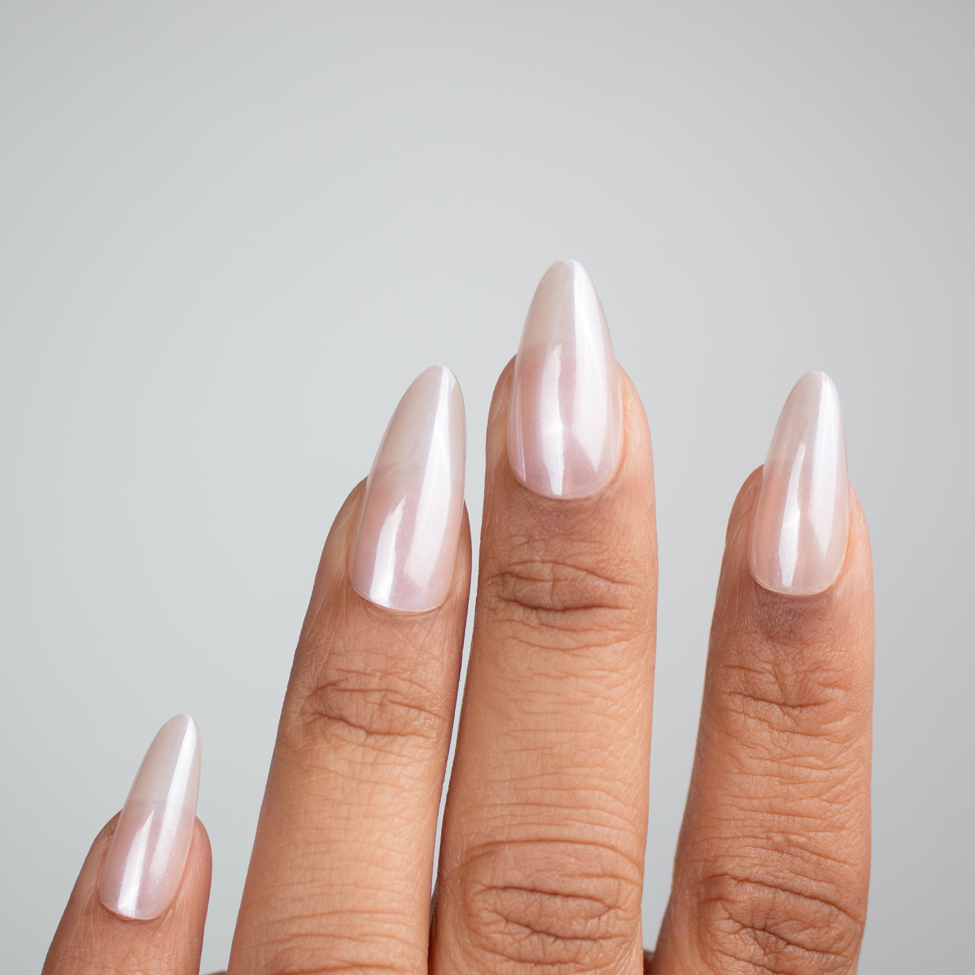 Indulge in the sweetness of Coconut Ice. A glazed doughnut effect finish that shimmers delicately with a pearlescent baby pink base in a long stiletto shape.