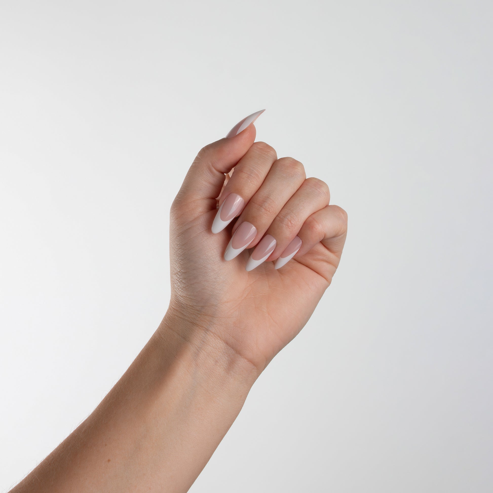 French Kiss, a classic white french tip in a sleek and sophisticated long stiletto shape.