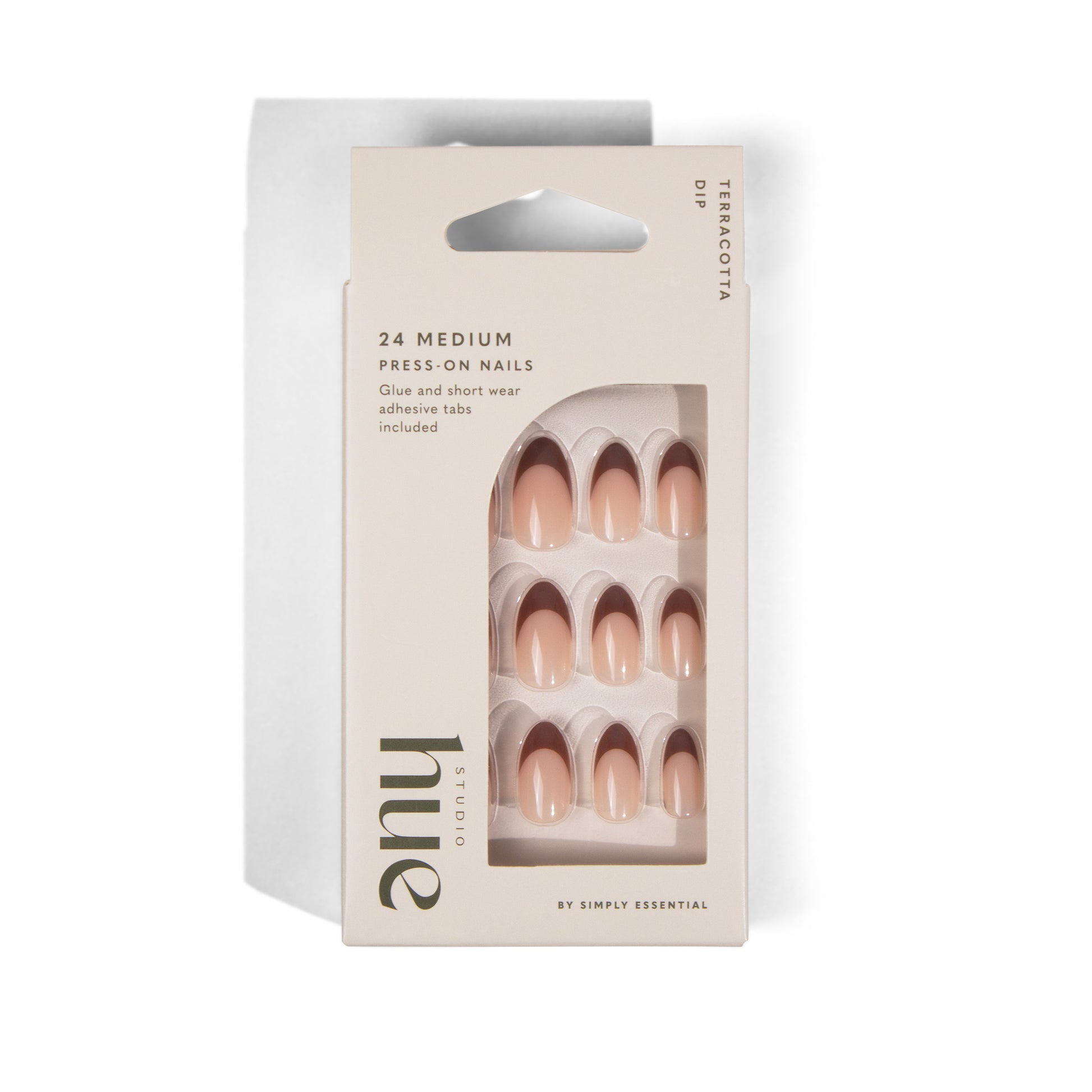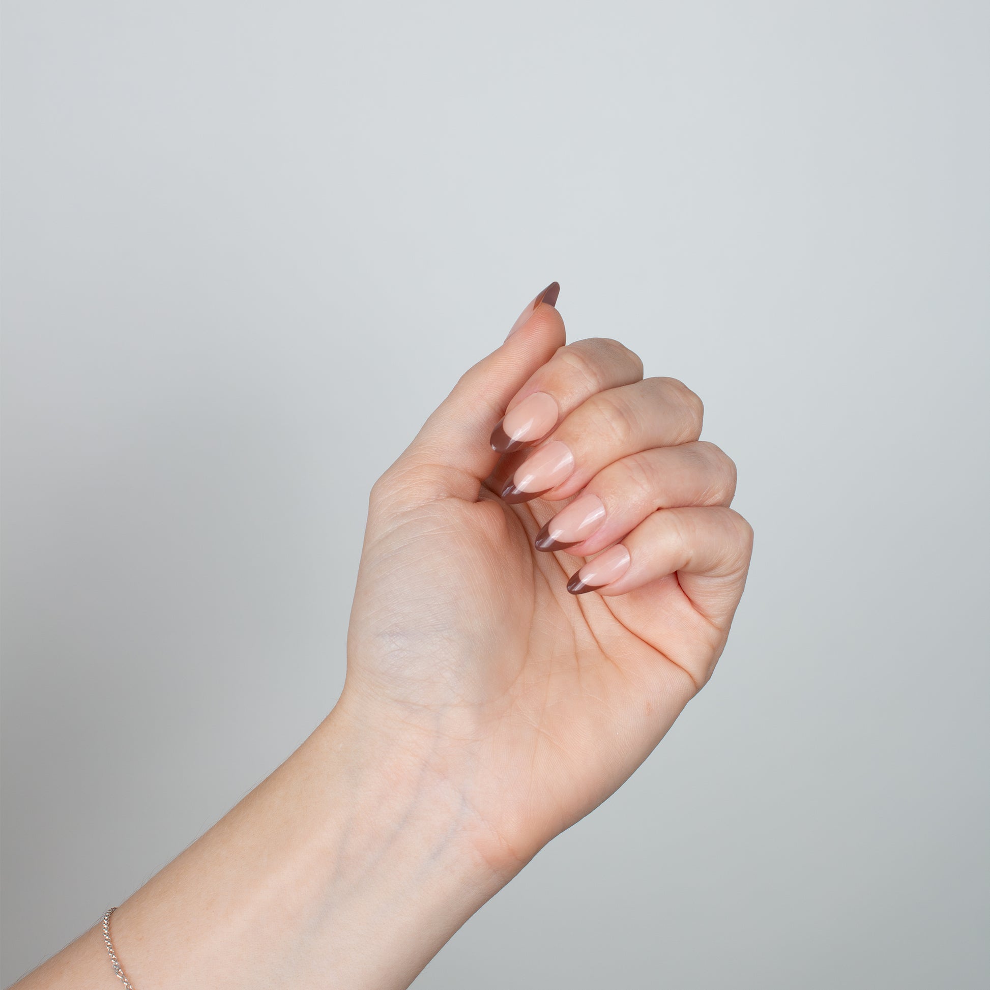 The classic french tip gets a makeover. Terracotta Dip exudes elegance with a dark reddy-brown tip on a classy medium almond shape.